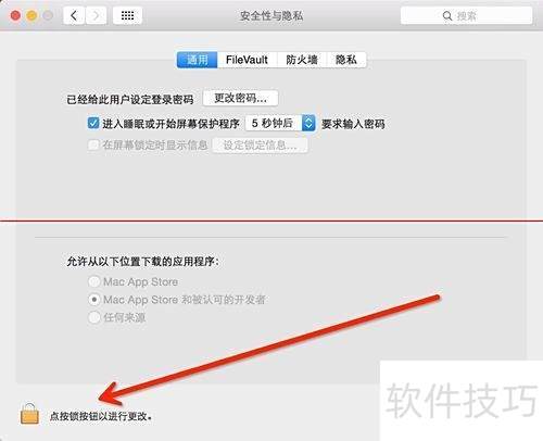 4、 点击通用,发现允许安装任何来源呈灰色不可选,需先点击左下角锁图标解锁设置。