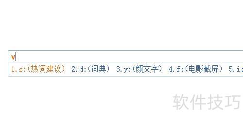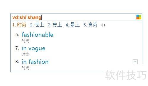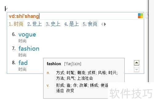 2、 将光标置于需翻译的位置,如输入时尚的英文,先键入字母v,随即激活V模式,提示相关词汇。