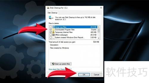 22、 磁盘清理开始运行后会弹出对话框,供您选择需删除的文件。请勾选临时文件类别下的所有项目,然后点击确定即可完成操作。