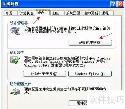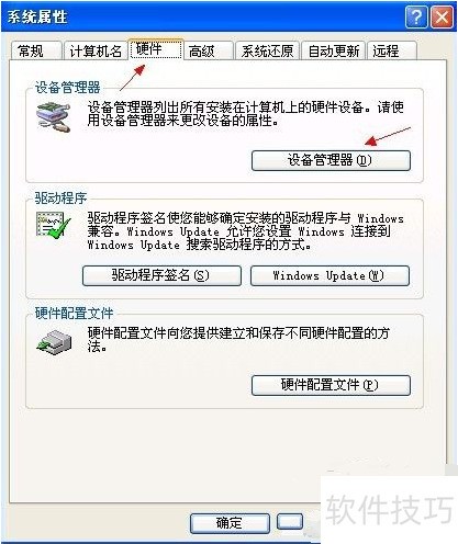 3、 进入系统属性窗口,切换至硬件选项卡,点击设备管理器按钮即可。