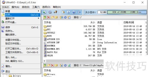 4、 启动UltraISO,点击文件菜单中的打开选项,选中已下载的PE镜像文件后确认。