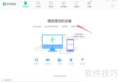 3、 打开客户端,用USB线将iPhone连接至电脑,操作所示。