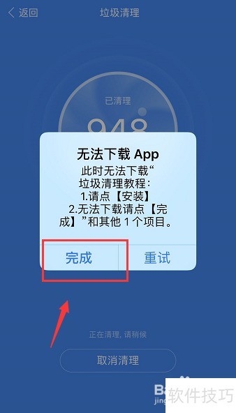 10、 系统启动清理时,可能出现下载失败提示,点击完成即可继续清理,具体所示。
