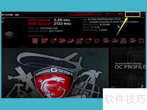 2、 微星主板进入BIOS后默认为英文界面,若不熟悉英文,可点击English选项,将其切换为中文显示,方便用户操作和设置。