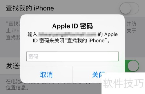 5、 由于该功能涉及iPhone安全,关闭前需输入当前iCloud账户的Apple ID密码以验证身份。