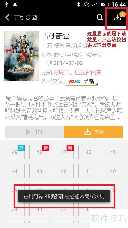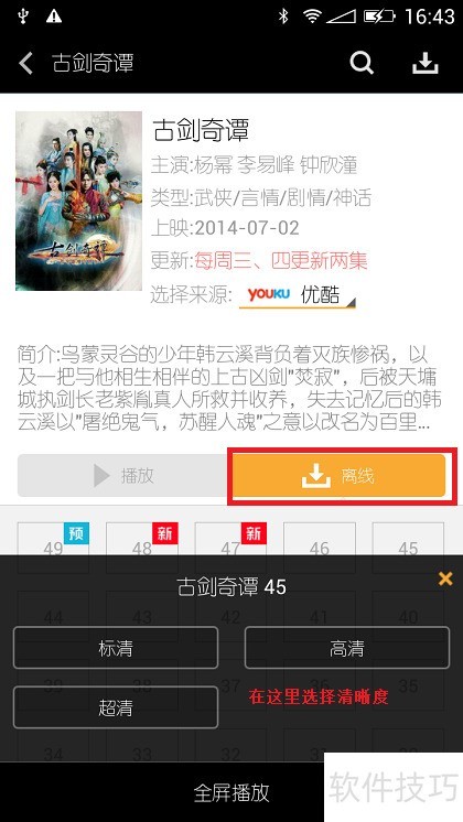 12、 点击选中剧集后,点击离线按钮,弹出下载窗口,选择所需清晰度即可开始下载,下载完成后会有提示,点击下载按钮可进入下载管理界面查看进度。