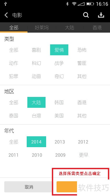 31、 点击筛选进入视频类型选择页面,选定类型、地区和年代后,确认即可迅速找到所需视频资源。