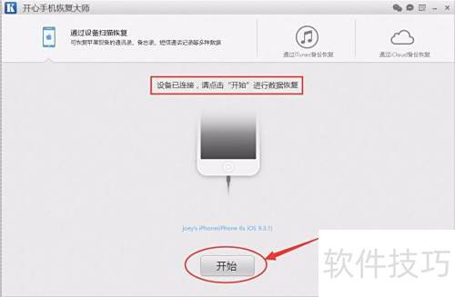 4、 当软件界面提示设备已连接时,表示手机已成功连接电脑,此时点击底部的开始按钮,即可进入数据恢复模式,准备进行数据恢复操作。