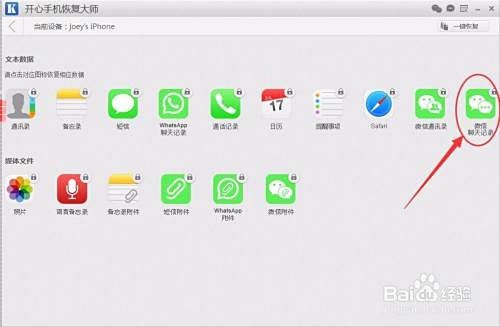 5、 进入数据恢复界面后,主页面显示多个数据类型图标,如短信、照片、微信聊天记录等,均可进行恢复。本次操作将重点恢复已删除的微信聊天记录。请找到微信聊天记录对应图标,点击进入下一步恢复流程。