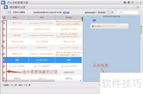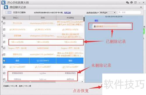 7、 扫描完成后,软件将进入微信聊天记录预览界面,用户可在此查看手机中的全部聊天记录,其中橙色文字表示已删除的内容,黑色文字为尚未删除的记录。