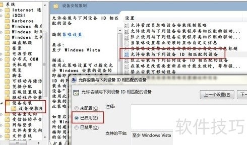 3、 打开运行对话框,输入 gpedit.msc 命令,启动组策略编辑器。依次展开计算机配置→管理模板→系统→设备安装→设备安装限制。双击允许安装与下列设备ID相匹配的设备,在设置页面中选择已启用,点击显示按钮,将事先保存在记事本中的设备ID逐一粘贴至列表中。完成添加后,返回设备安装限制目录,双击禁止安装未由其他策略设置描述的设备,勾选已启用,点击确定保存设置,最后关闭组策略窗口,完成配置。