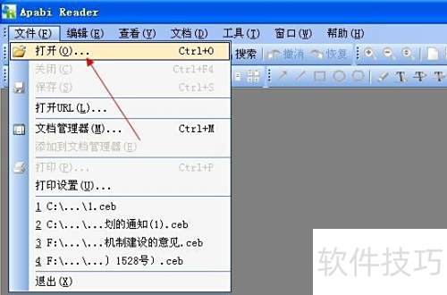 3、 安装并启动Apabi Reader后,点击左上角的文件选项。