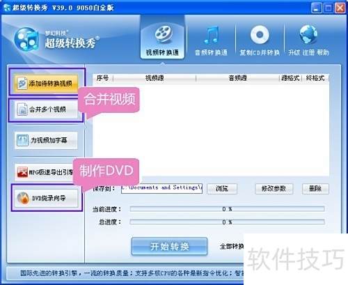 2、 根据界面提示操作,点击左上角添加待转换视频按钮,即可导入需要转为FLV格式的RMVB视频文件。该软件支持多种视频格式,导入过程简单便捷,兼容性强。在操作界面中,还可通过点击合并多个视频功能,轻松将多个RMVB视频整合为一个FLV文件,提升处理效率。此外,软件内置DVD烧录向导,能够将转换后的视频内容刻录成DVD光盘,操作直观,功能全面,满足用户在视频格式转换、合并及光盘制作方面的多种需求,实用性较高。