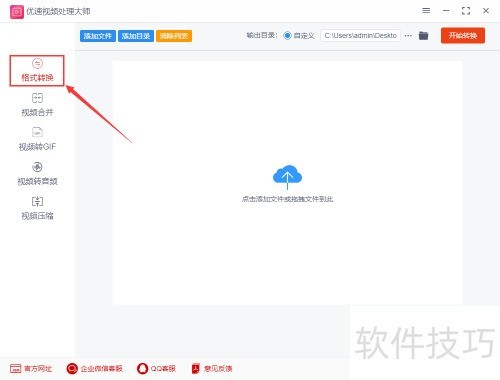 1、 首先启动电脑,运行优速视频处理大师2.0.7,进入软件界面后选择左侧顶部的格式转换功能,即可开始将FLV文件转换为MP4格式。