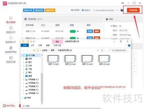 3、 完成设置后,点击开始转换按钮,启动视频格式转换。转换完成后,软件将自动打开输出文件夹,可立即查看生成的MP4视频文件,方便快捷地获取转换结果。