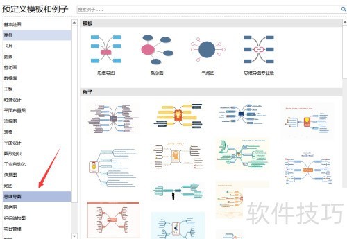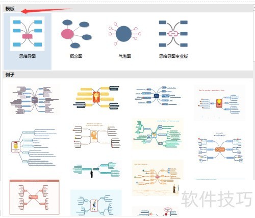 2、 提供思维导图模板及对应实例,模板栏可选思维导图类型。