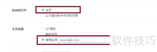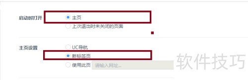 6、 主页提供三个选项:默认进入UC导航页,可更改为新标签页或指定页面。若需启动时打开新标签页,请按如下方式设置。