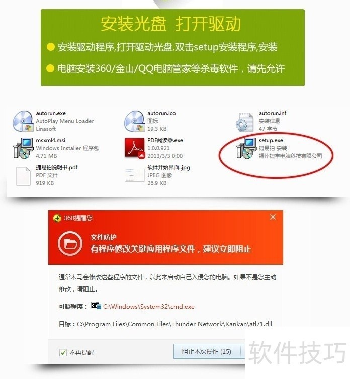 7、 插入驱动光盘,运行setup程序进行安装。若电脑装有360、金山或QQ电脑管家等杀毒软件,请先暂时允许安装操作。