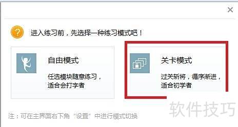 3、 接下来选择关卡模式并进入打字基础训练,这一步至关重要,直接影响日后打字速度。请同学们认真反复练习,连续通关,注意手指摆放位置,每一个细节都很关键。