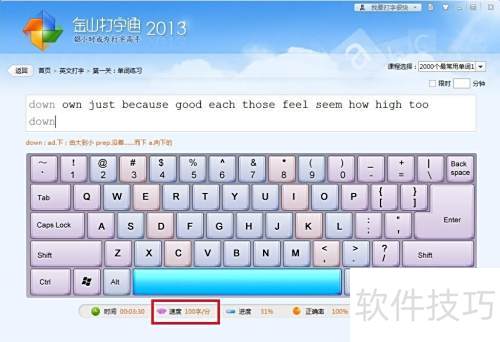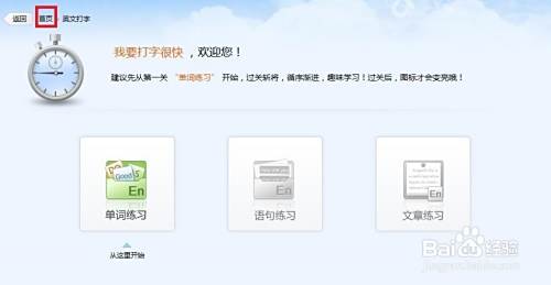 4、 完成测试后,我们将进行英语单词、句子及文章的练习,这些是学习的基础环节,虽看似简单,却需坚持。同时可检测你的打字速度,具体操作所示。