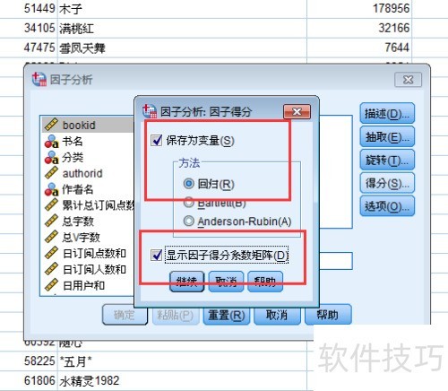 5、 采用回归法计算因子得分,勾选保存为变量,并勾选显示因子得分系数矩阵。