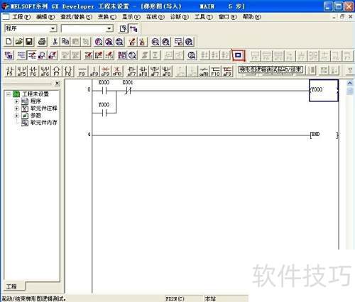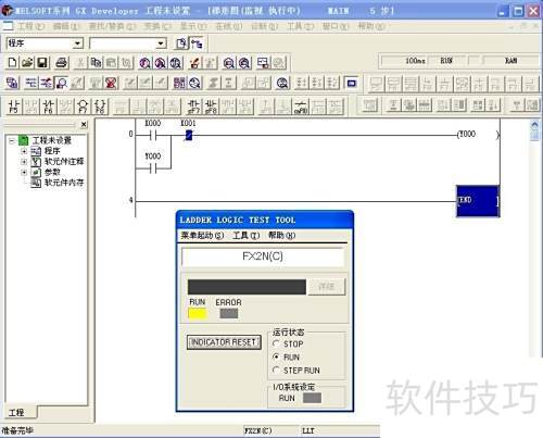5、 变换后运行仿真,点击梯形图逻辑测试图标,所编程序即传送到模拟PLC中执行。