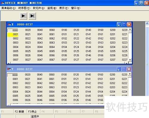 6、 传输完成后,点击模拟窗口中的寄电器内存监视,在弹出的对话框中选择软元件X和Y,即可查看所有输入输出软元件的仿真按钮。