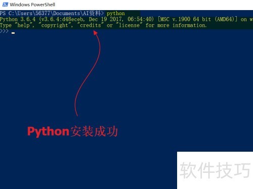 17、 在PowerShell中输入python命令,若显示所示信息,则表明Python已成功安装。