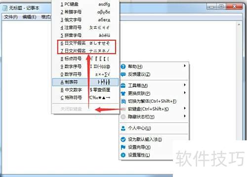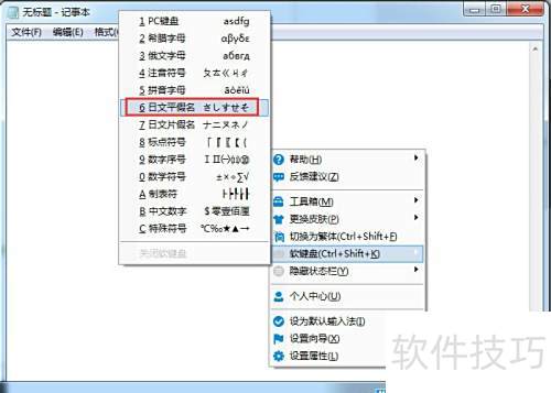 6、 百度输入法支持日文输入,可通过软键盘实现。调出方法为:先启动百度输入法,再按下Ctrl+Shift+K组合键即可显示软键盘。软键盘显示片假名或平假名,取决于此前在设置中选择的是第6项还是第7项,系统会根据上次选择自动切换相应假名类型。