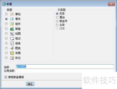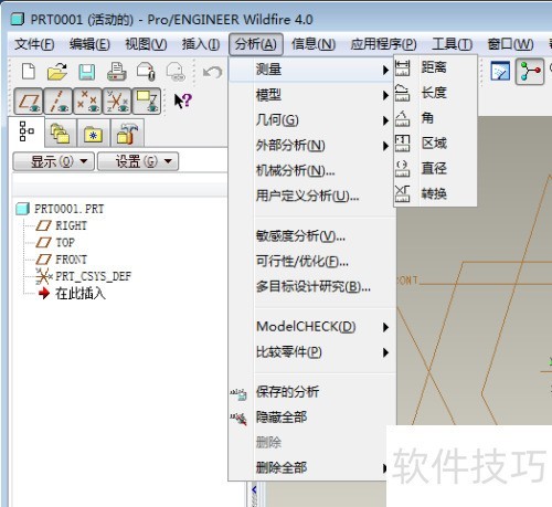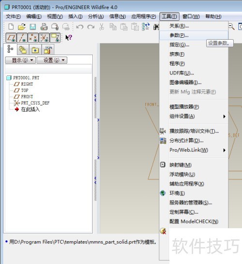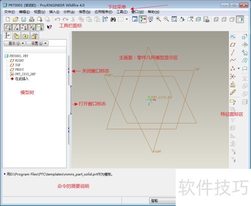 2、 新建零件后,可熟悉PRO/E界面结构,包括功能菜单、绘图区域、模型树、命令栏及工具栏等主要组成部分。