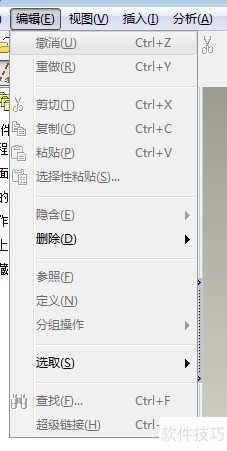 4、 在菜单栏点击编辑,可看到复制、粘贴、重做、剪切等选项。由于绘图区域尚未绘制图形,这些命令目前均显示为灰色不可用状态。