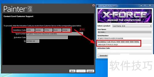 10、 重新启动Corel产品密钥生成器2018,将Painter 2018安装时生成的安装代码复制并粘贴至激活工具的安装代码输入框中,随后点击生成或激活按钮,完成授权验证流程,即可成功激活软件并正常使用全部功能。