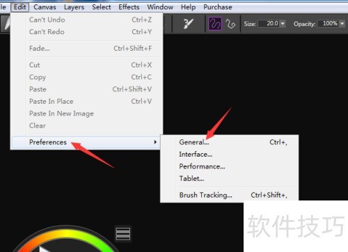 1、 在菜单中选择编辑,从下拉列表里点击偏好设置,随后进入常规选项。