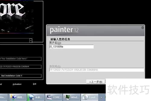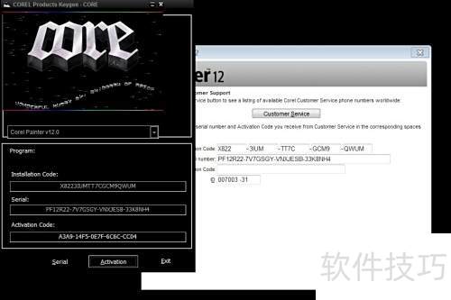 10、 将页面上的安装代码复制并粘贴至注册工具的相应输入框,点击注册工具中的激活按钮,生成对应的激活码。随后,将生成的激活码复制并填入网页中的激活码输入栏,最后点击继续按钮,即可顺利完成Corel Painter12的激活流程。