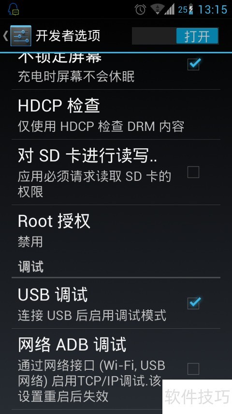 3、 请确保手机已开启USB调试模式,通常可在设置中的开发者选项找到并启用该功能,具体操作方法所示。