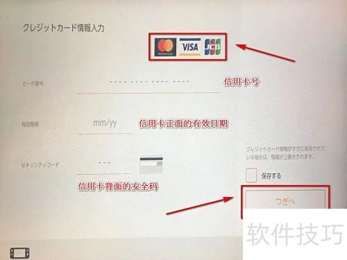 4、 日服eshop支持MasterCard、VISA和JCB信用卡,美服仅支持MasterCard与VISA。输入卡号、有效期及安全码后,点击右侧按钮即可完成购买。