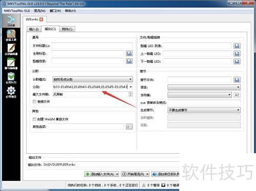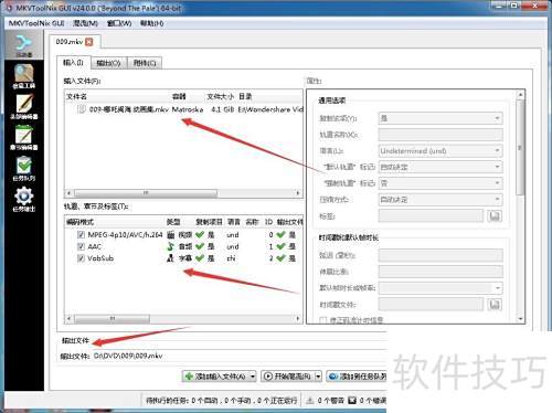 3、 添加后下方轨道、章节及标签窗口会显示相应内容,接着在输出文件处选择保存至电脑的路径。