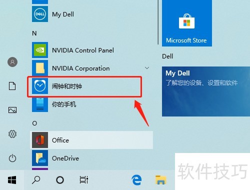 6、 点击开始菜单,查找并打开闹钟和时钟应用。