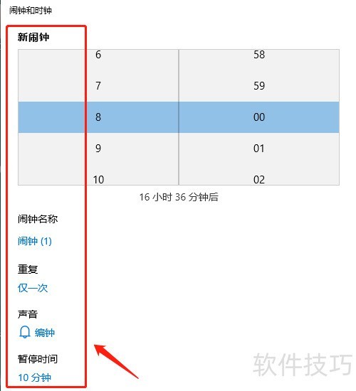 4、 设置新闹钟时,可设定时间、名称、提醒方式、铃声及间隔时长。