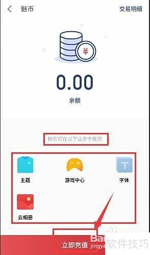 6、 进入魅币充值页面后选择立即充值,魅币适用于主题、游戏、字体及云相册等服务,不可用于手机话费充值,充值前请仔细阅读相关协议内容。