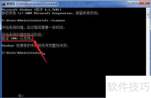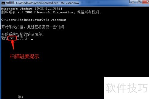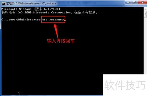 3、 在命令提示符中输入 sfc /scannow 后按下回车执行。