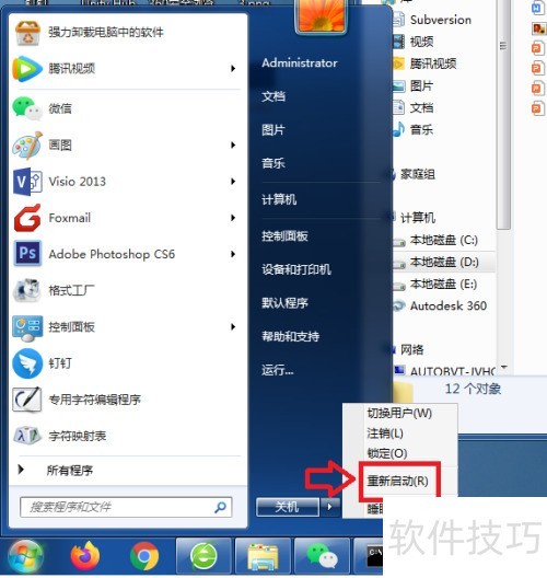 6、 重启电脑,点击开始菜单中的重新启动选项。