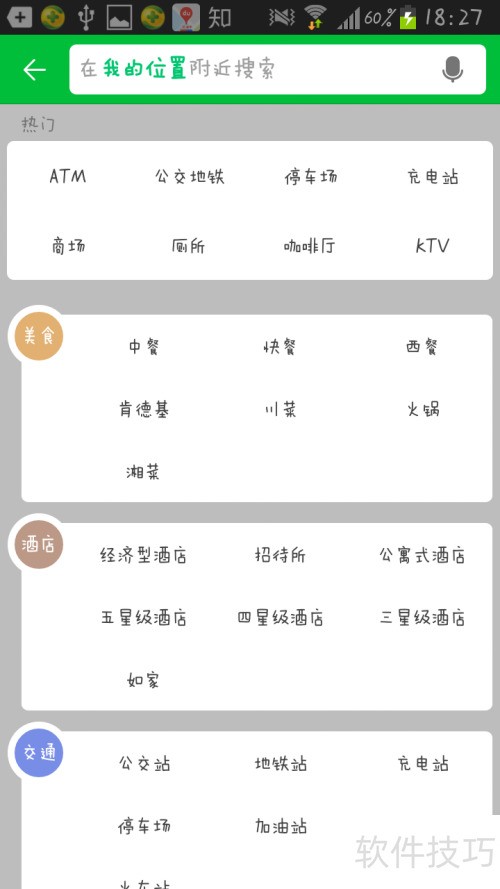 7、 点击首页附近按钮,即可进入搜索页面,方便查找周边的餐馆、加油站、酒店、交通、银行、娱乐及生活服务等信息。
