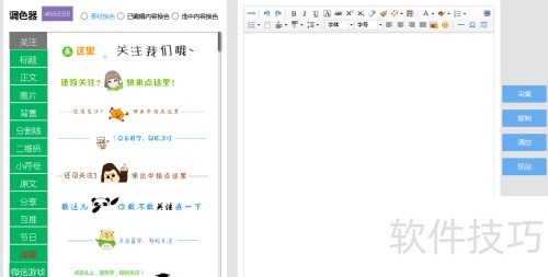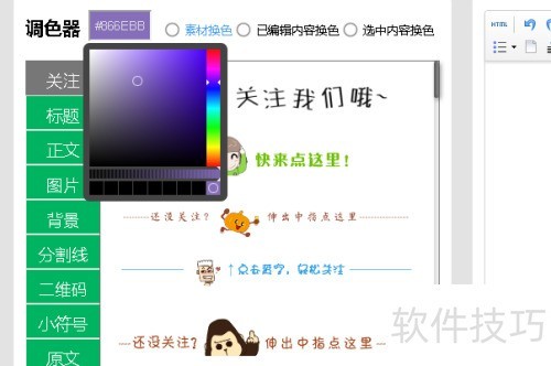 4、 图片左上角为颜色调整区,此为改版后新设位置,仅可修改部分文本框颜色,文字颜色需在编辑区内进行调整。