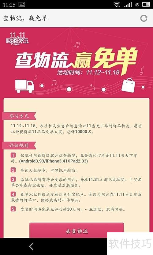 9、 双十一已过,等待收货的日子有点漫长。12号记得上手机淘宝查物流,还能参与抽奖赢免单好礼。