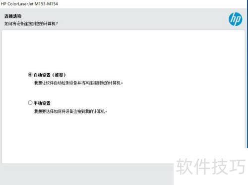3、 安装过程中出现图示界面后,将弹出连接选项窗口,选择自动设置,程序将自动搜索并连接网络中的打印机。