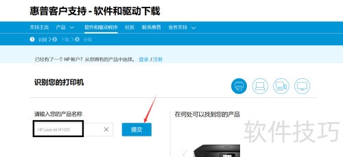 4、 点击后,在识别打印机界面输入型号并提交,操作所示。
