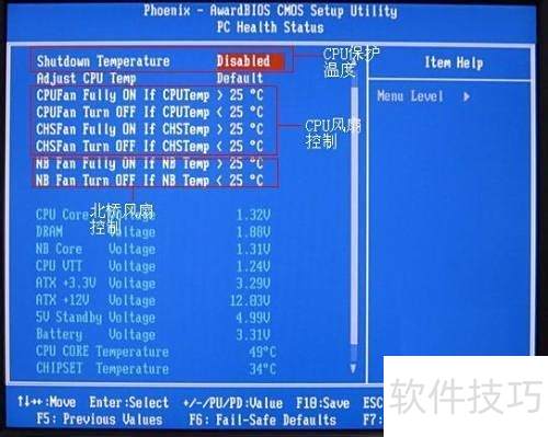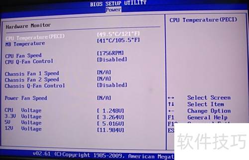 5、 开机时持续按下Del键进入BIOS,随后选择电源菜单中的HEALTH选项,即可查看CPU温度信息。不同主板界面略有差异,具体操作可参考主板说明书。