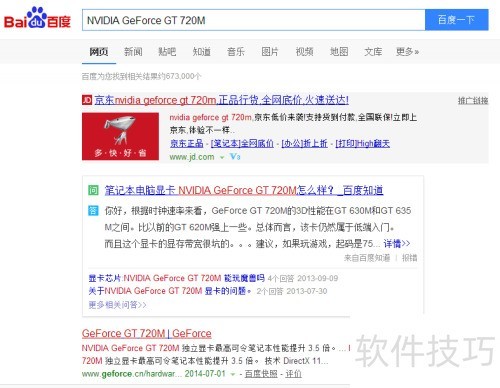 1、 打开电脑,运行浏览器,进入百度首页,搜索NVIDIA GeForce GT 720M相关信息。
