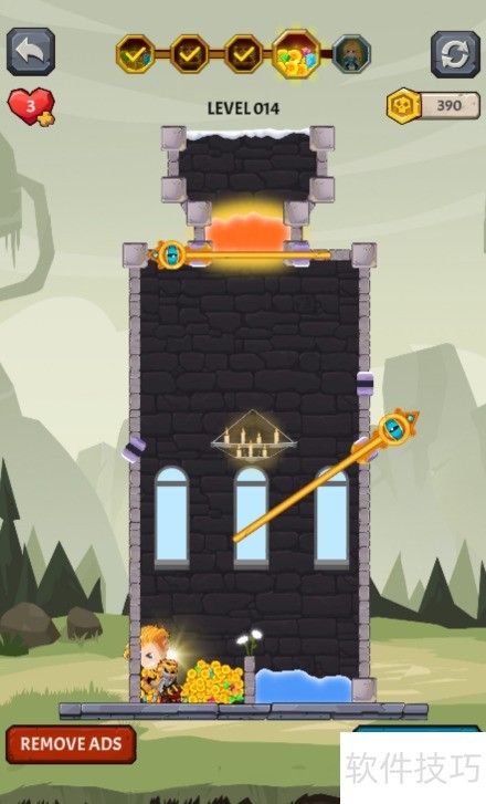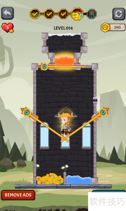 1、 本关目标为获取黄金,少年位于熔岩右下方,区域内分布着四枚别针,具体布局见示意图。